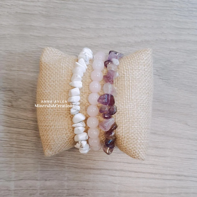 • Tris di Howlite Bianca, Quarzo Rosa e Ametista