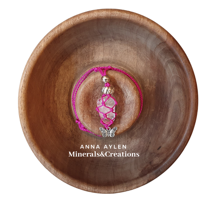 Collana My Aura filo fuxia, Cristallo di Rocca, farfalla